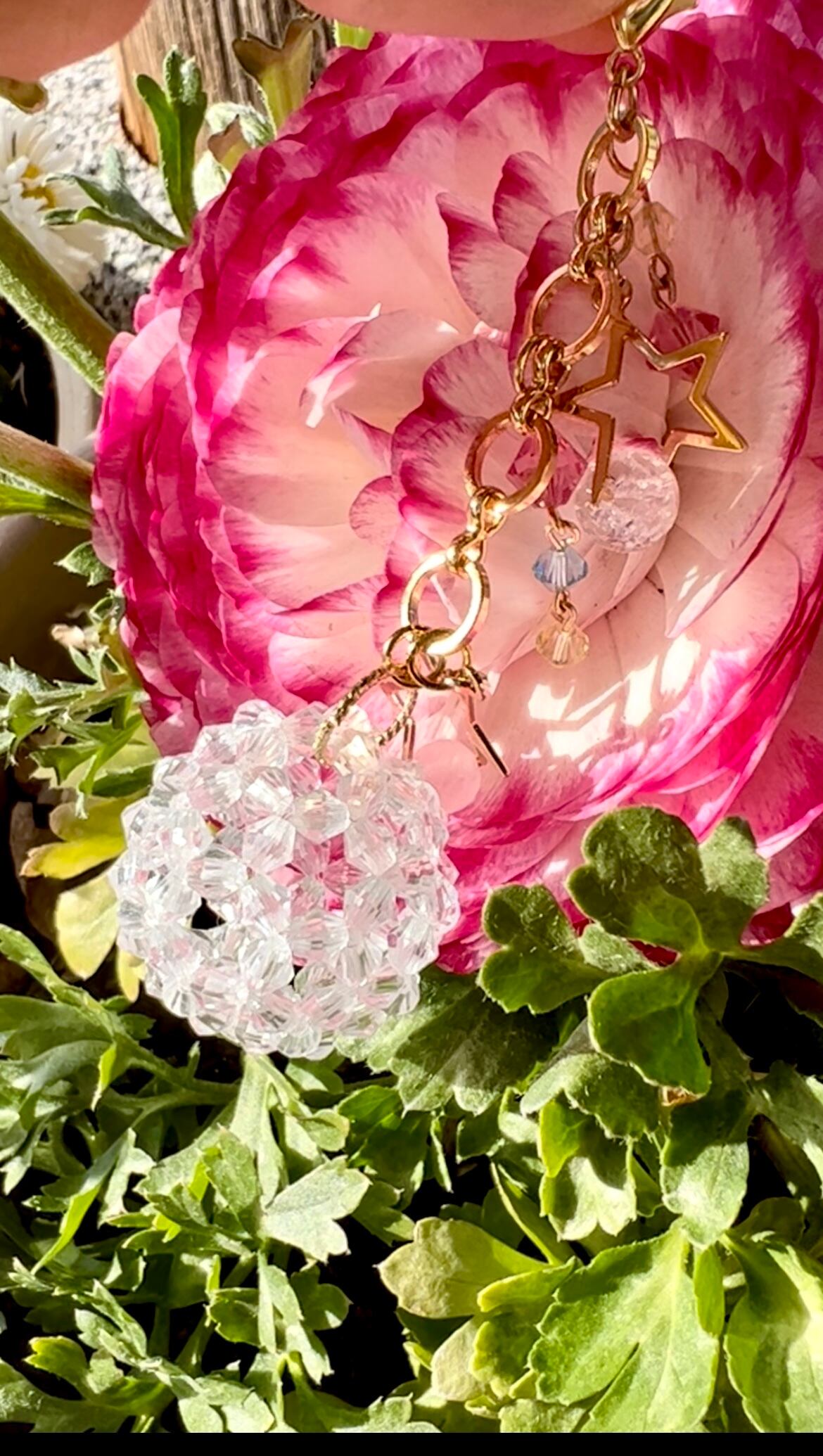 フラーレンボールと天然石、スワロフスキーのキラキラチャームです。 天然石 ✴︎クラック水晶 ✴︎ローズクォーツ